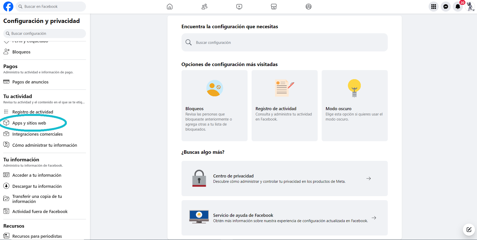 Ve a la sección de Apps y sitios web, aquí podrás ver toda tu actividad relacionada a aplicaciones y páginas web registradas en tu cuenta de Facebook.