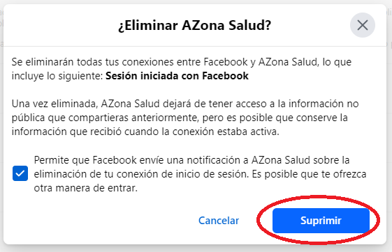 En concordancia con las regulaciones de Facebook para Apps y sitios web, debemos brindarle a los usuarios las instrucciones para eliminar sus datos. Si quieres eliminar tu actividad relacionada a AZona Salud, lo puedes hacer de la siguiente manera.